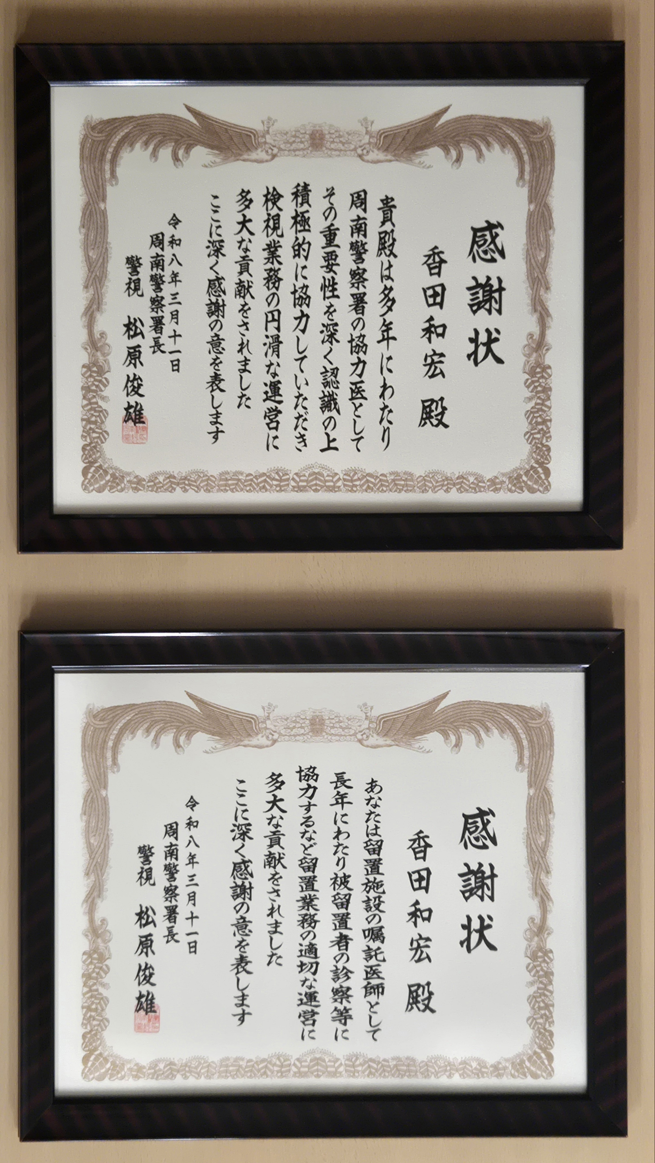 お知らせ 2026/03/17 院長には秘密で・・・ 周南警察署長より、香田院長が感謝状をいただきました。日頃から協力医(検案など)として活動してきたことによる感謝状だそうです。院長室にそっと隠してあった感謝状を見つけたのでこっそり上げました。 by職員