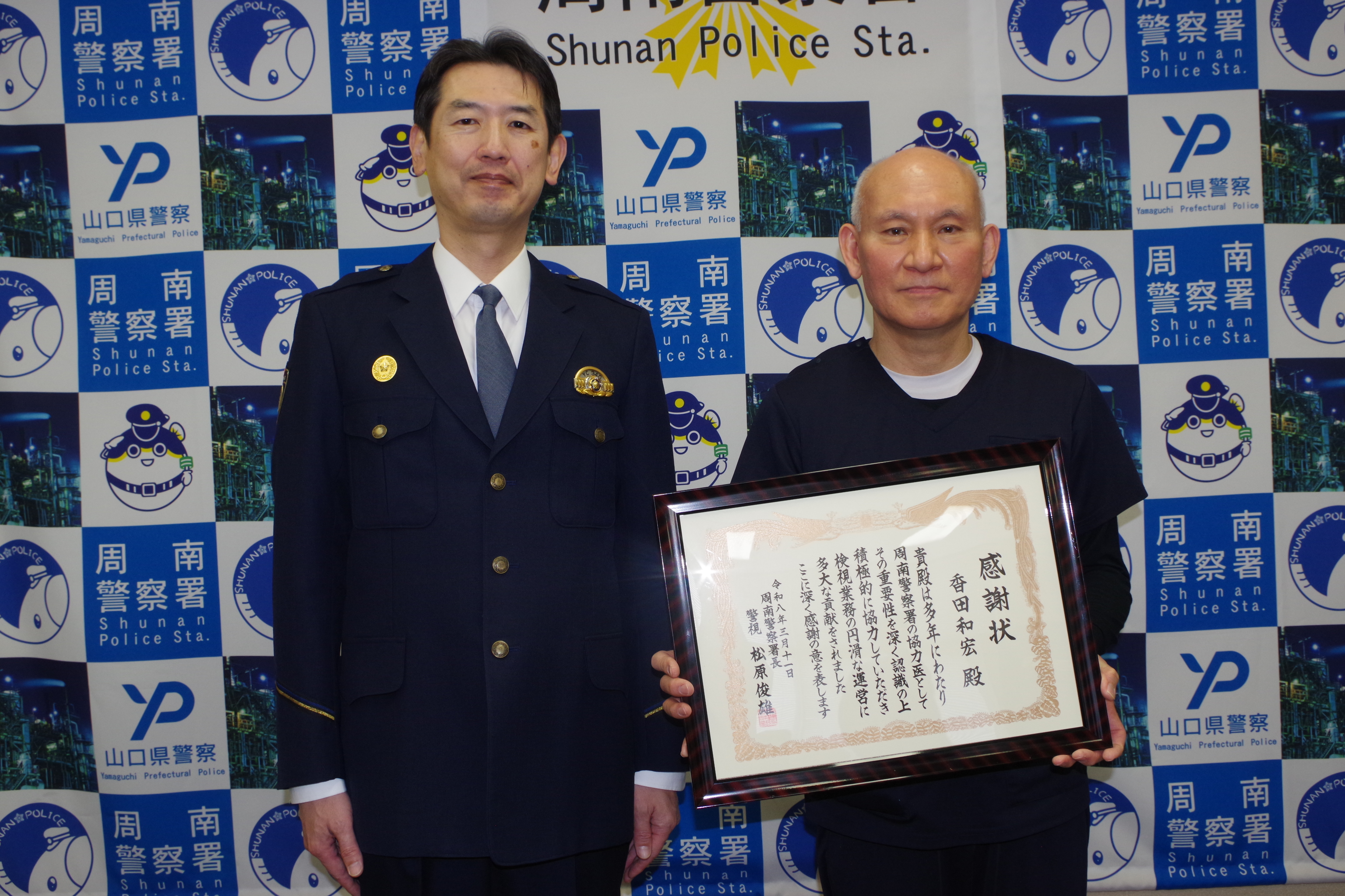 お知らせ 2026/03/17 院長には秘密で・・・ 周南警察署長より、香田院長が感謝状をいただきました。日頃から協力医(検案など)として活動してきたことによる感謝状だそうです。院長室にそっと隠してあった感謝状を見つけたのでこっそり上げました。 by職員